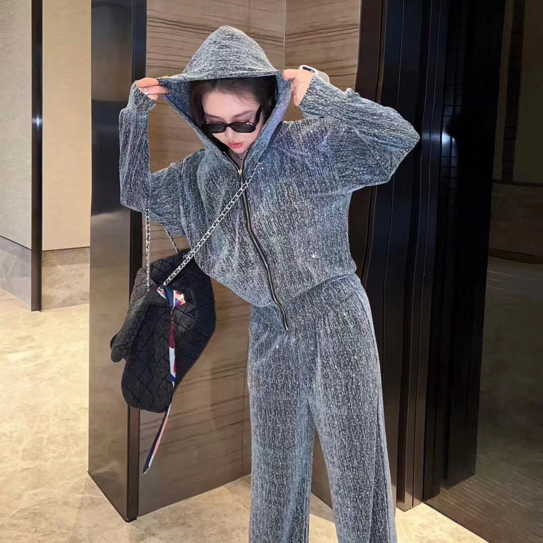 AW shiny silk hot diamond zipper jacket + wide-leg pants